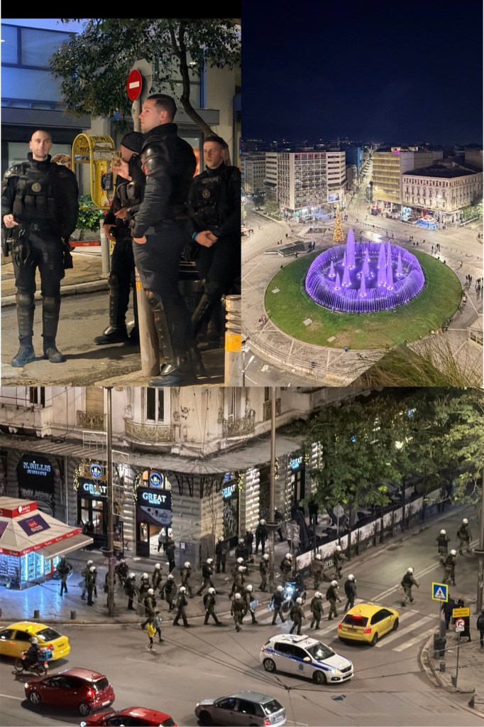 If you’re planning a trip to Greece, it’s worth keeping in mind that December 6th can be a tense day in Athens. This date marks the anniversary of the 2008 police shooting of 15-year-old Alexandros Grigoropoulos in the Exarcheia district, and it’s often observed with protests and occasional riots. On our recent visit, we were caught off guard by the sudden demonstrations—police and military were everywhere, and a wave of protesters moved through the city and metro stations before vanishing just as quickly. Within minutes, the square returned to its usual calm, leaving only the memory of a brief, surreal interruption.